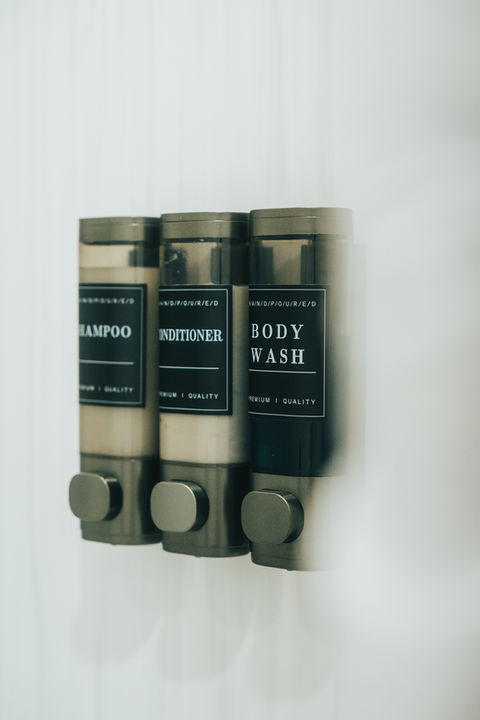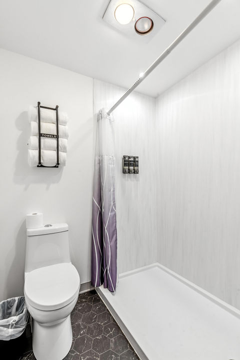 Your private bathroom features a sleek walk-in shower, complete with fresh towels and essential toiletries for your convenience. The clean, modern design creates a calming atmosphere perfect for unwinding.